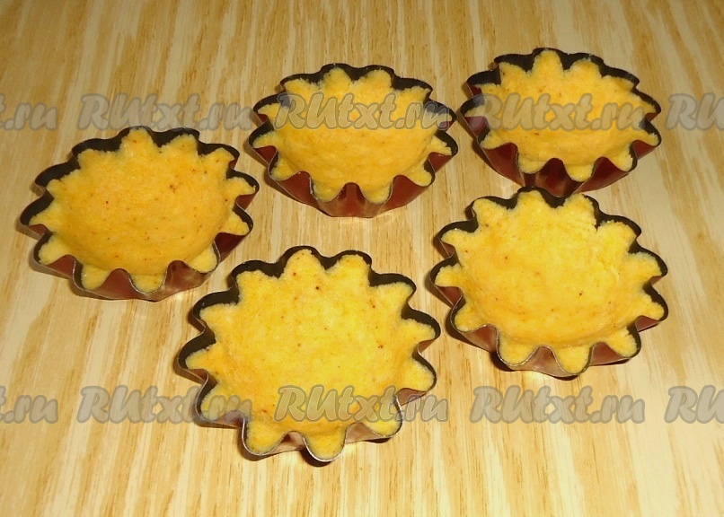 Равномерно распределить тесто в формочках, предварительно слегка смазанных растительным маслом. Выпекать тарталетки из кукурузной муки в духовке при температуре 170-190 градусов 15-20 минут.