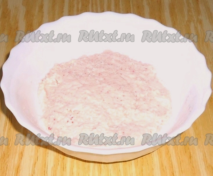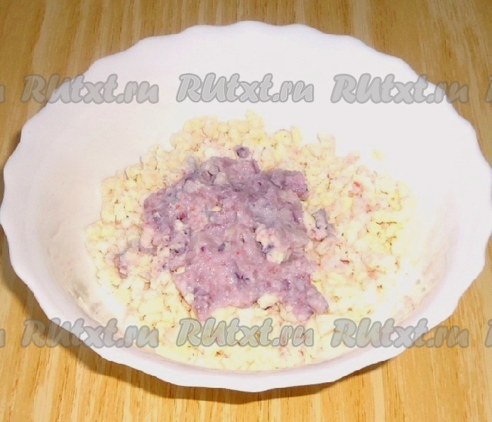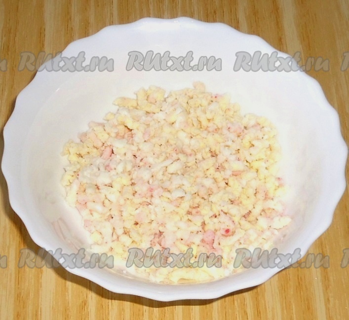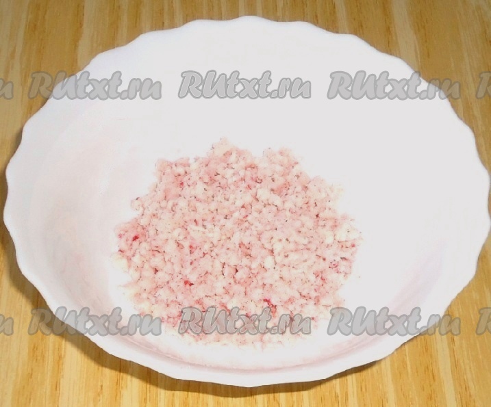Пока тарталетки остывают, приготовить паштет. Крабовые палочки пропустить через мясорубку.