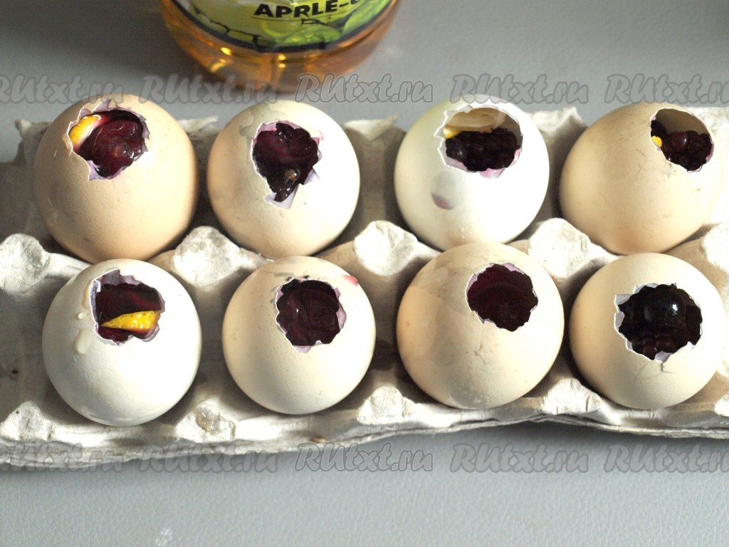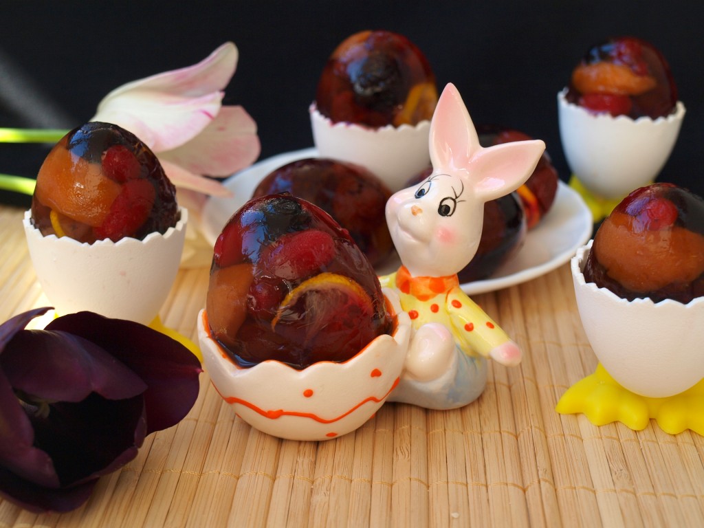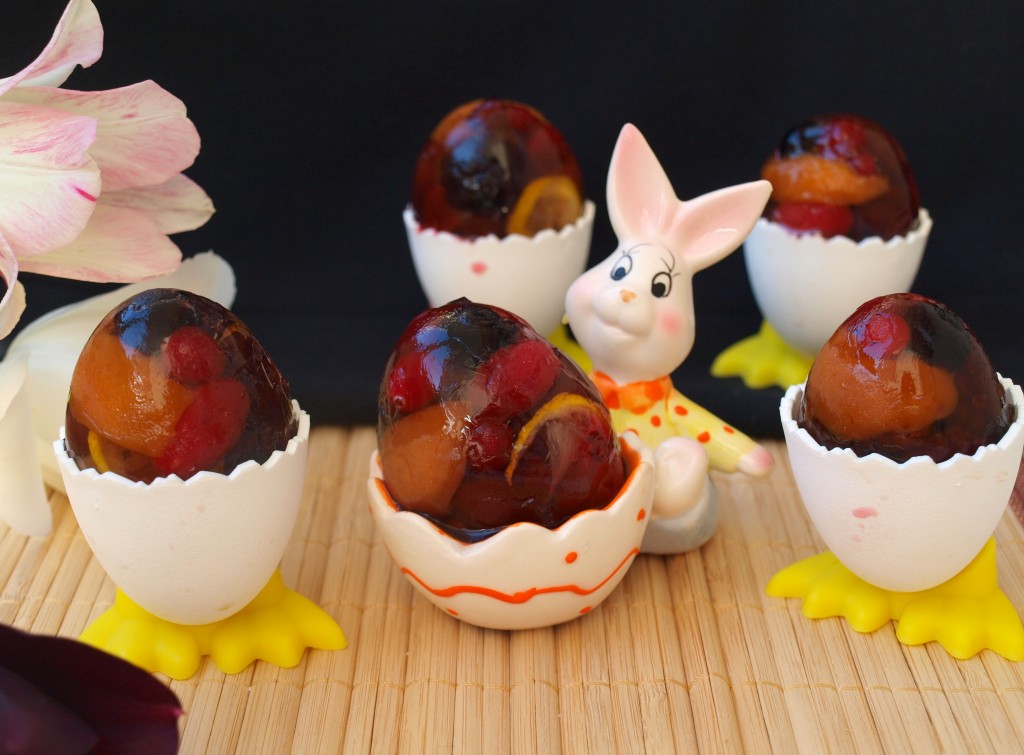 Застывшие яйца, очищаем от скорлупы. И подаём на праздничный стол заливные фруктовые яйца.
