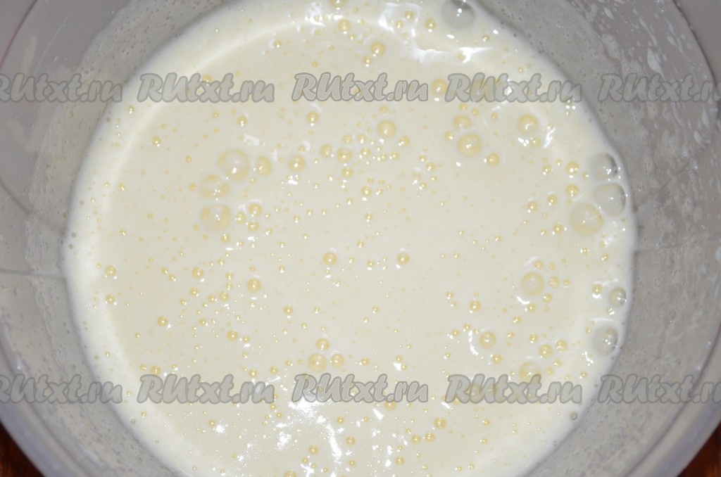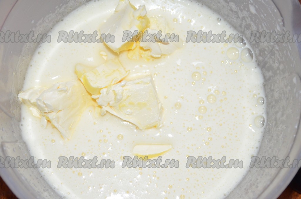 Добавить мягкое масло, кефир, взбить.