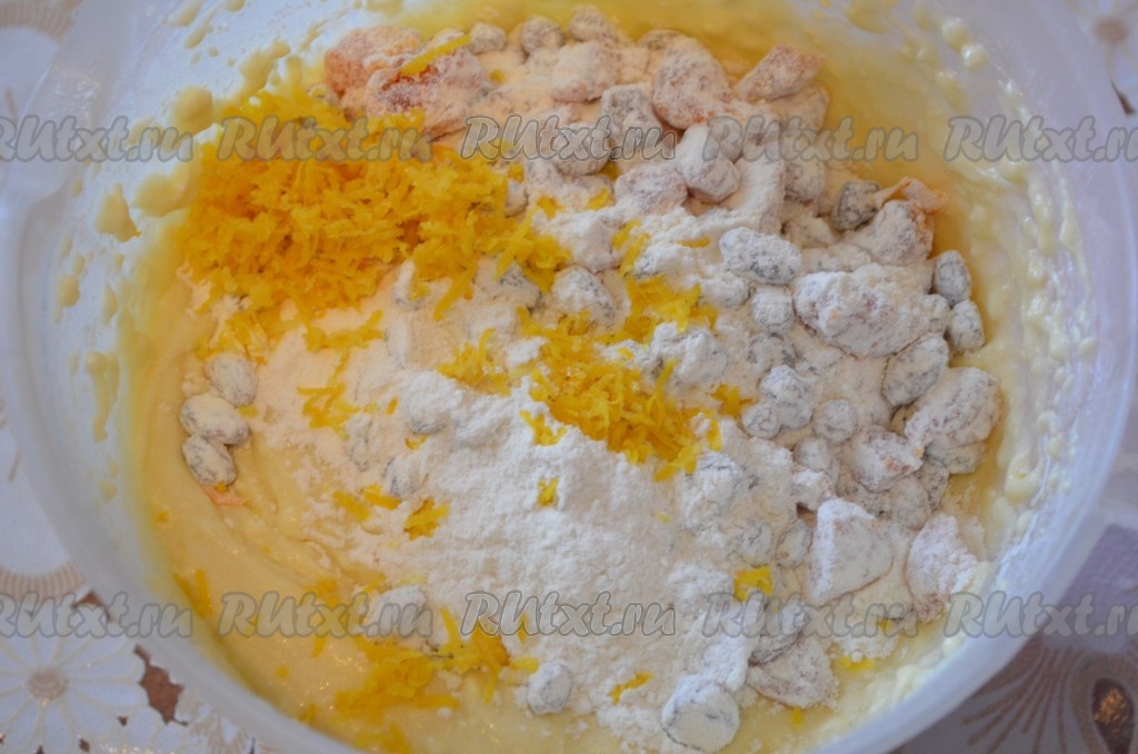 В тесто вмешать сухофрукты и цедру лимона.