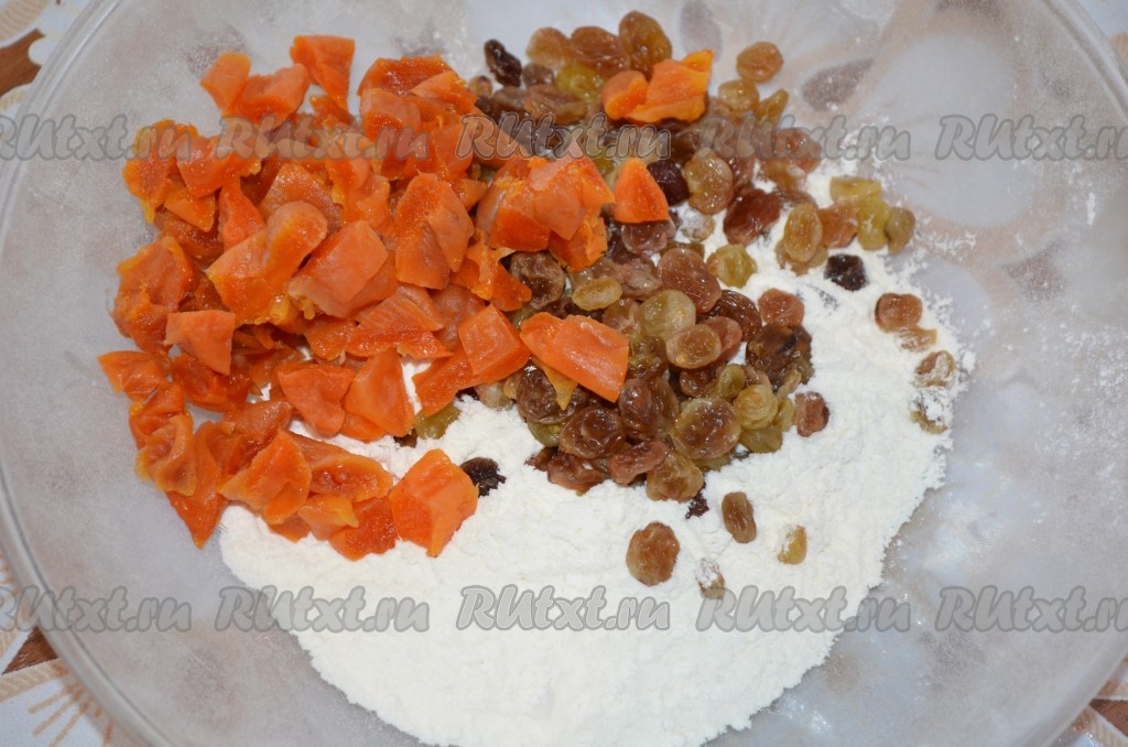 Распаренные изюм и курагу (порезать) смешать с остальной мукой.