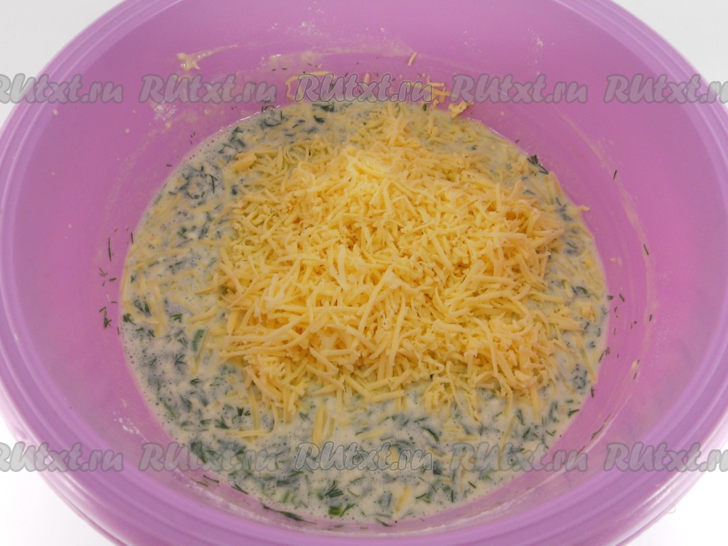 Всыпать разрыхлитель, частями добавить просеянную муку. После добавления каждой порции муки блинное тесто нужно тщательно перемешивать. Всыпая частями муку, учитывайте, что блинное тесто должно получиться не жидким, как вода, но и не густым. В тесто добавить мелко нарезанную зелень и натёртый на мелкой тёрке твёрдый сыр.