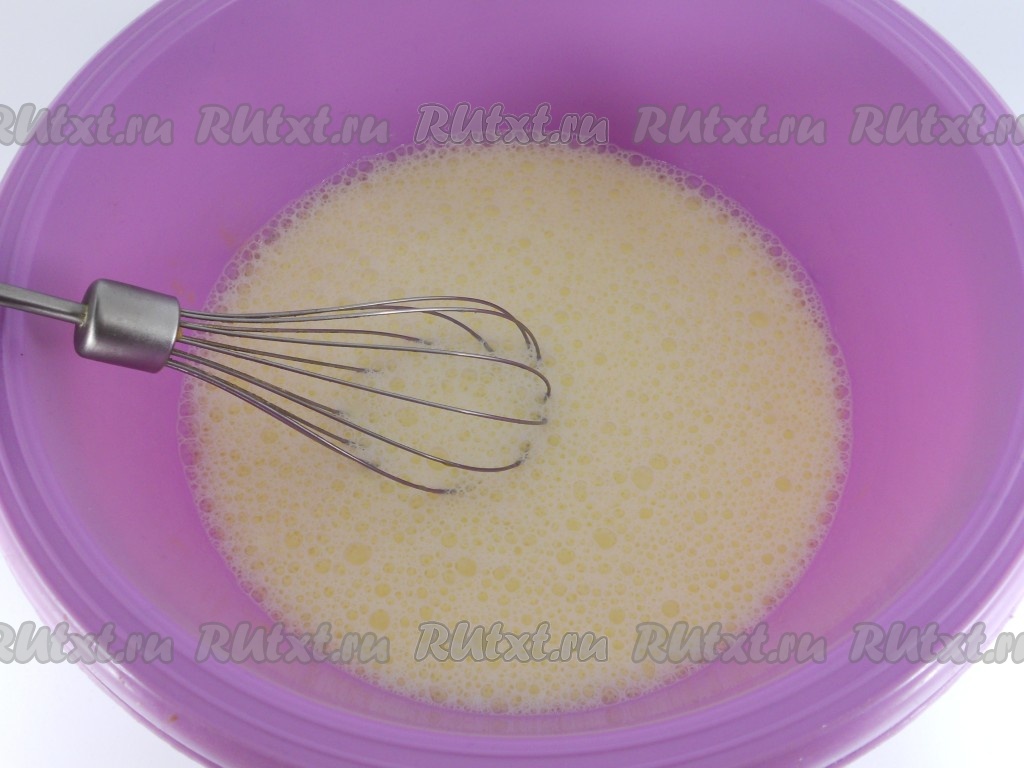 Слегка взбить венчиком, влить молоко, продолжая взбивать.