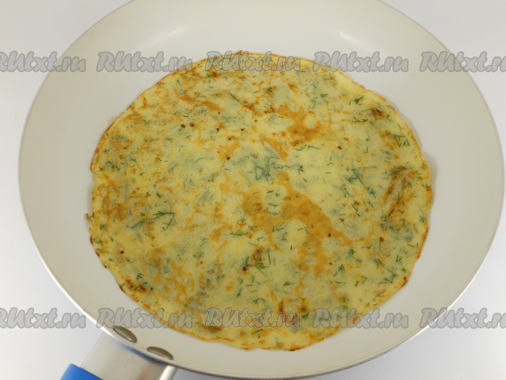 Влить растительное масло и хорошо перемешать блинное тесто. Смазать разогретую сковороду один раз растительным маслом (в дальнейшем сковороду маслом можно не смазывать, но многое зависит от качества покрытия сковородки), налить часть теста, равномерно распределить его и жарить сырный блин с зеленью до румяности на среднем огне с двух сторон, затем переложить на тарелку. Аналогично пожарить все блины, периодически перемешивая тесто. Блинчики получаются не очень тонкими.