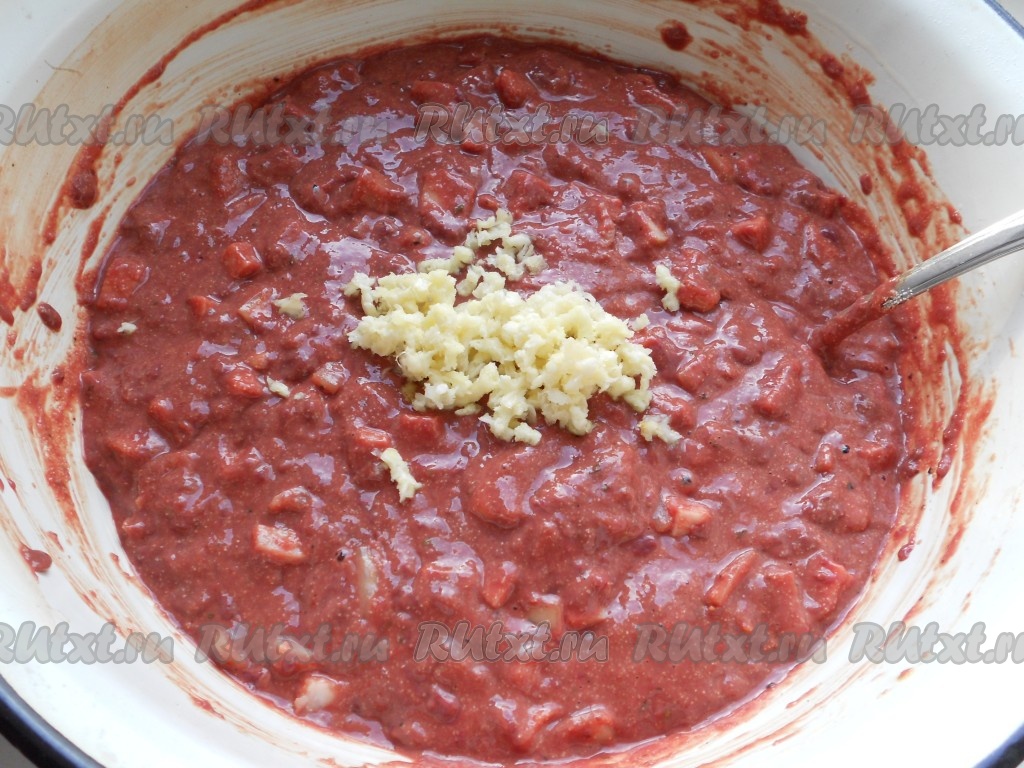 Снова перемешать и добавить чеснок, пропущенный через пресс.