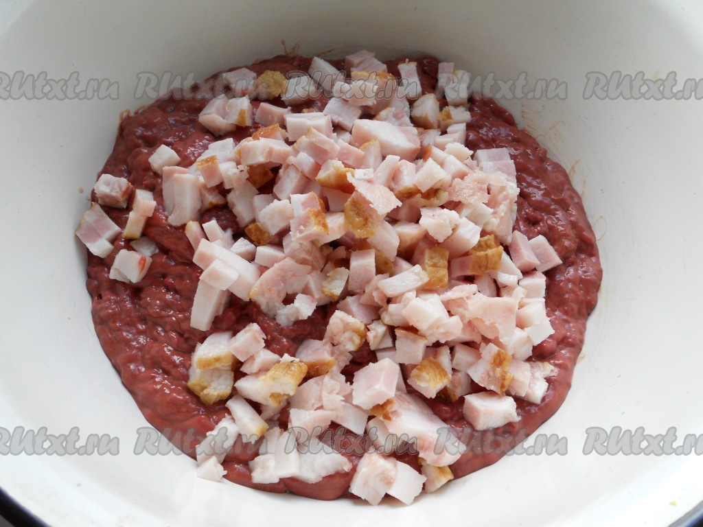 Печень перекрутить на мясорубке. Добавить сало, порезанное мелкими кубиками.