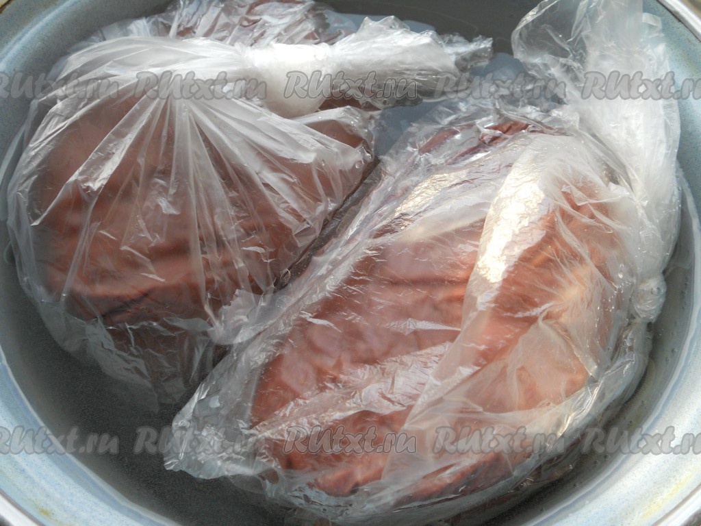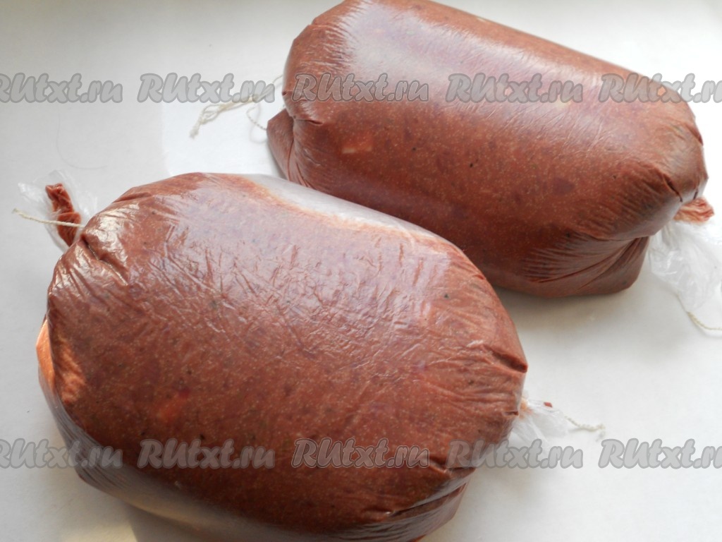 Еще раз тщательно перемешать массу и выложить в целлофановые пакеты, плотно утрамбовать фарш, связать с двух сторон нитками. Поместить каждую колбаску еще в один пакет, завязать.