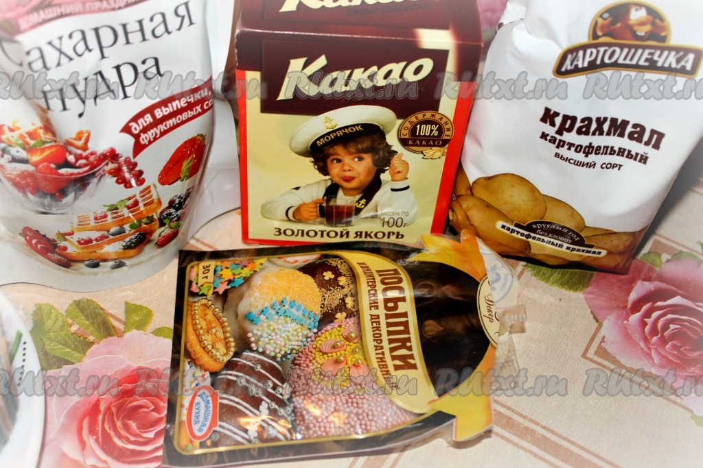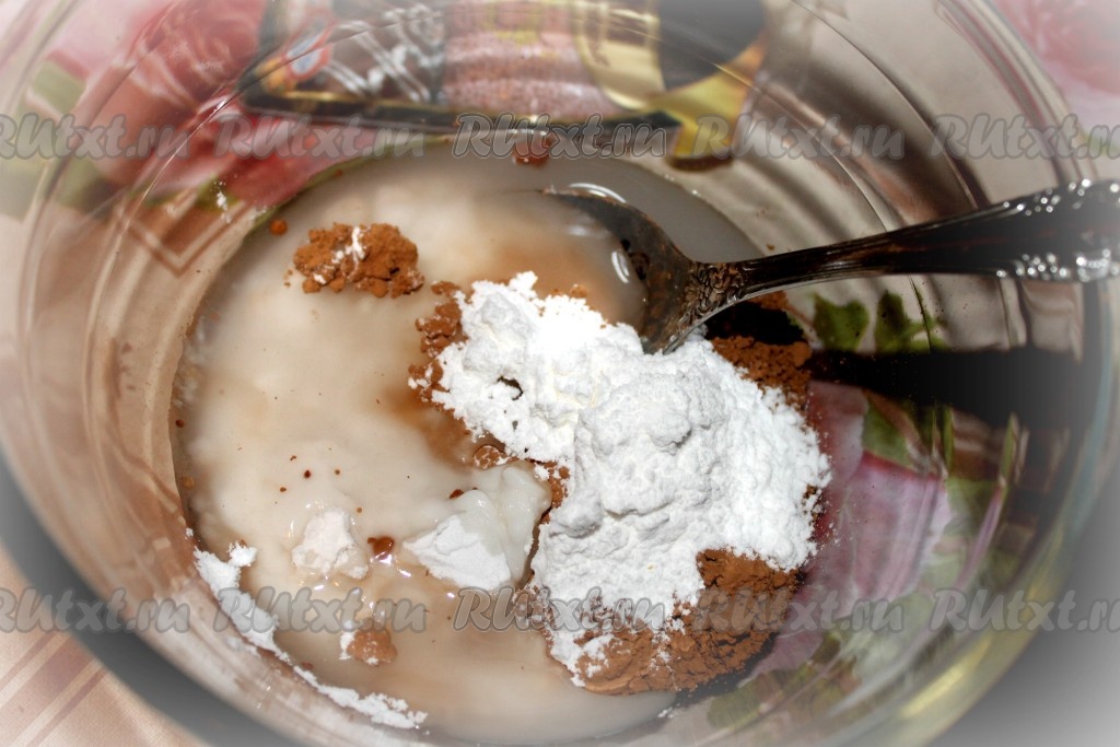 В сухую глубокую мисочку насыпать сахарную пудру, какао и крахмал. Добавить охлаждённую воду. Чем меньше воды, тем гуще будет глазурь.