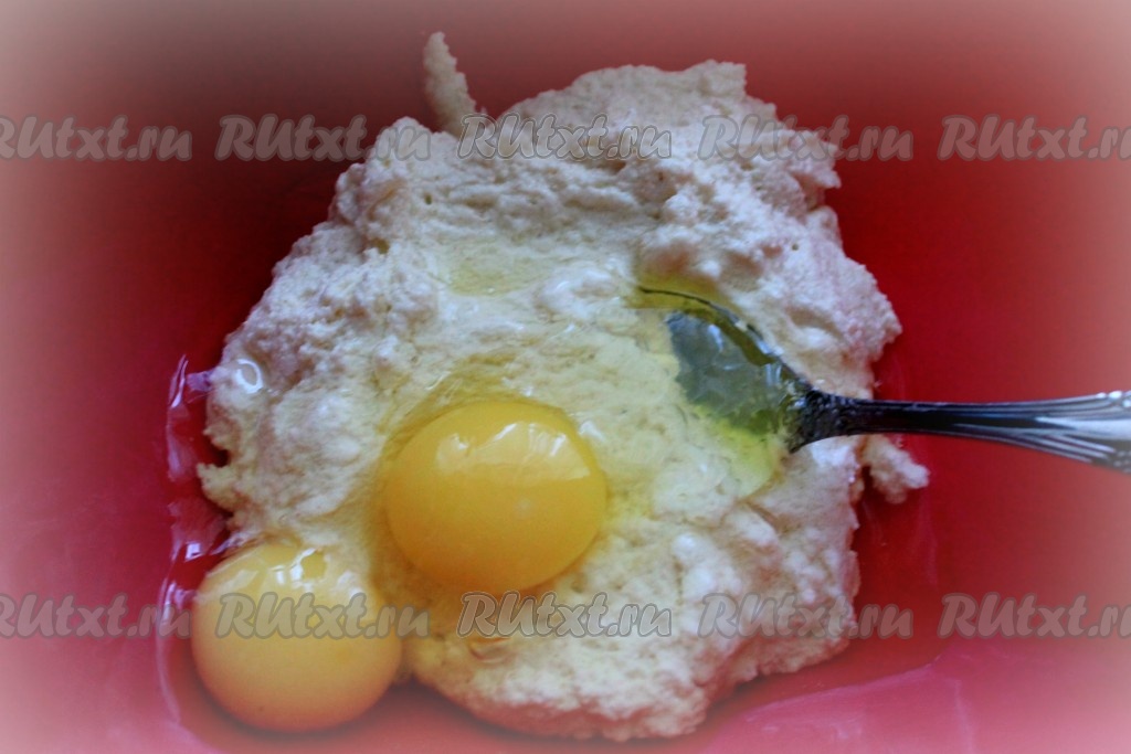 По прошествии времени в смесь кефира и манки добавить яйца и перемешать.