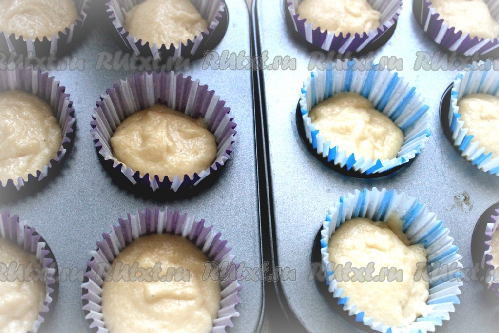 Бумажные вкладыши вставить в формы для кексов, разложить тесто, заполняя формы на 2/3 объёма. Если нет бумажных вкладышей, можно смазать формы растительным маслом. Выпекать манные кексы, замешанные на кефире, в разогретой духовке минут 20-30 минут при температуре 180 градусов.