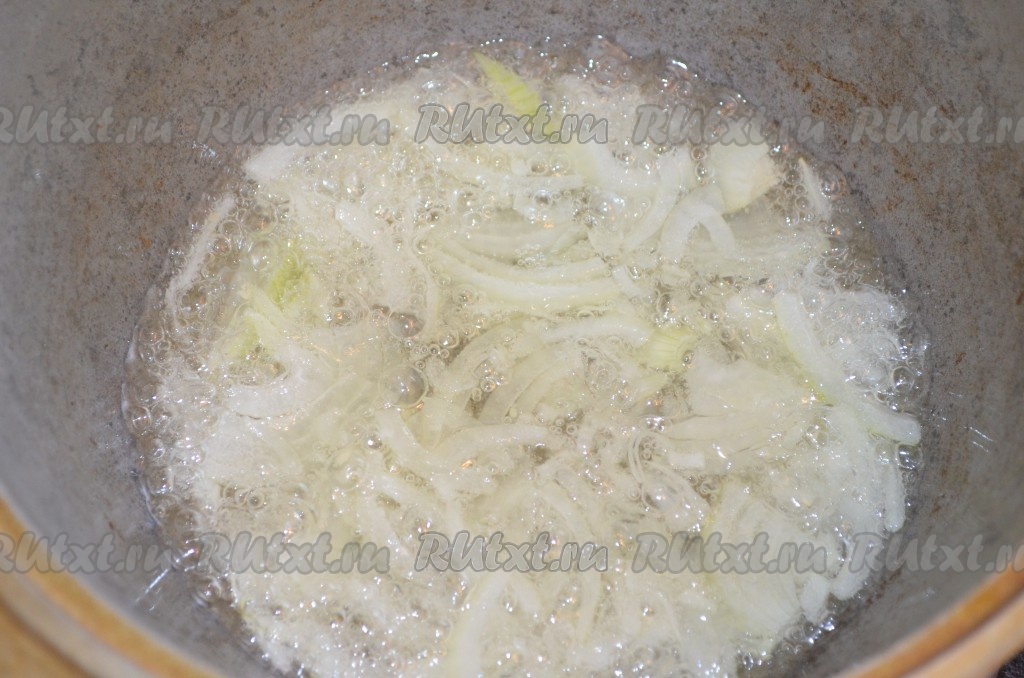 Лук порезать полукольцами. Разогреть в казане масло, обжарить лук до золотистого цвета.