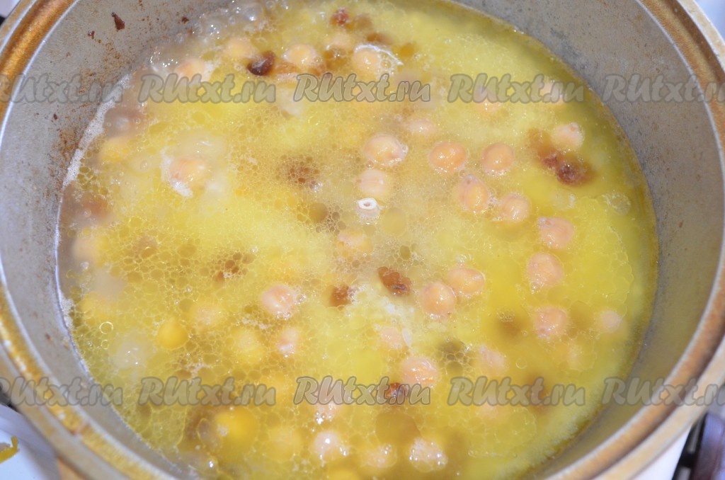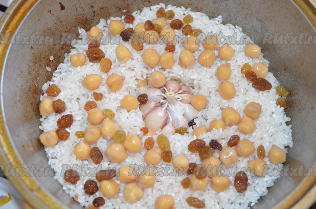 Нут заранее отварить почти до готовности. Для этого заливаем горох холодной водой, ставим на сильный огонь, даем закипеть, затем делаем минимальный огонь и варим. Через 1 час нужно его попробовать, если мягкий, огонь выключить. Рис и изюм промыть. На мясо уложить слой риса ровно. На рис нут и изюм. Посолить (0,5 чайной ложки соли), добавить чеснок целой головкой.