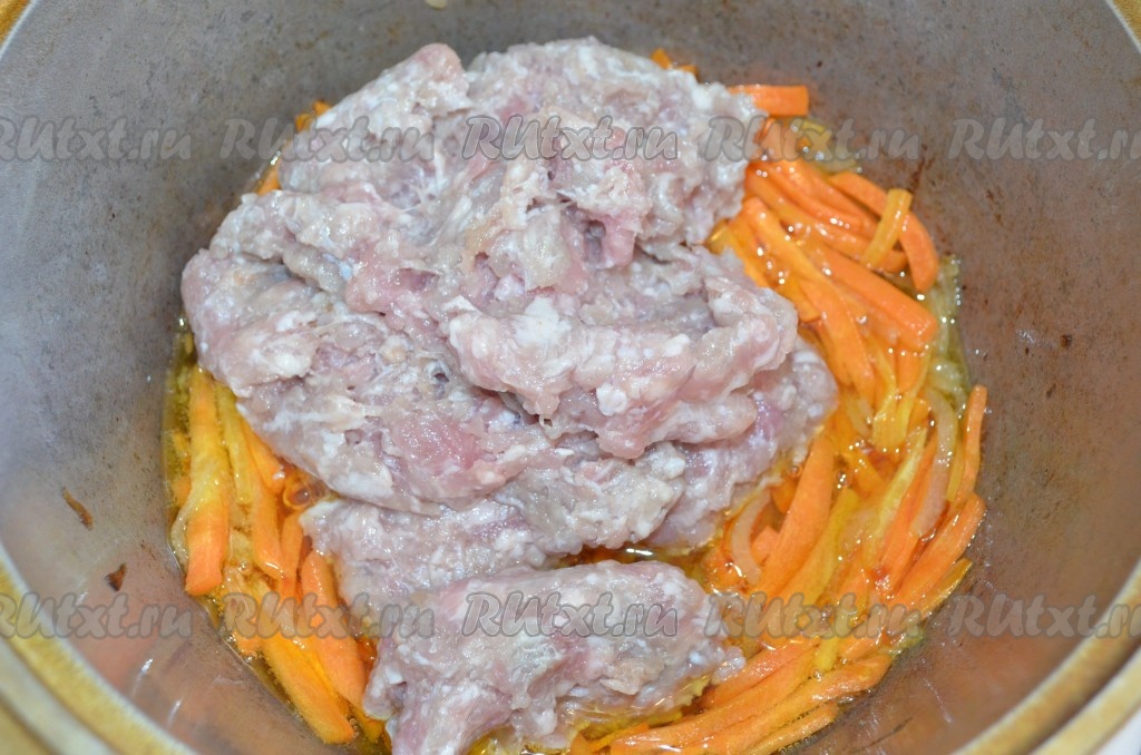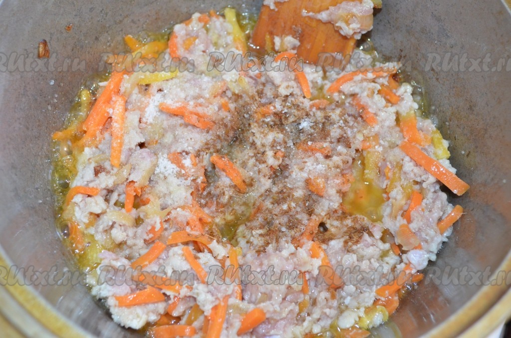 Затем добавить фарш. Жарить до выпаривания жидкости и еще 3-5 минут.