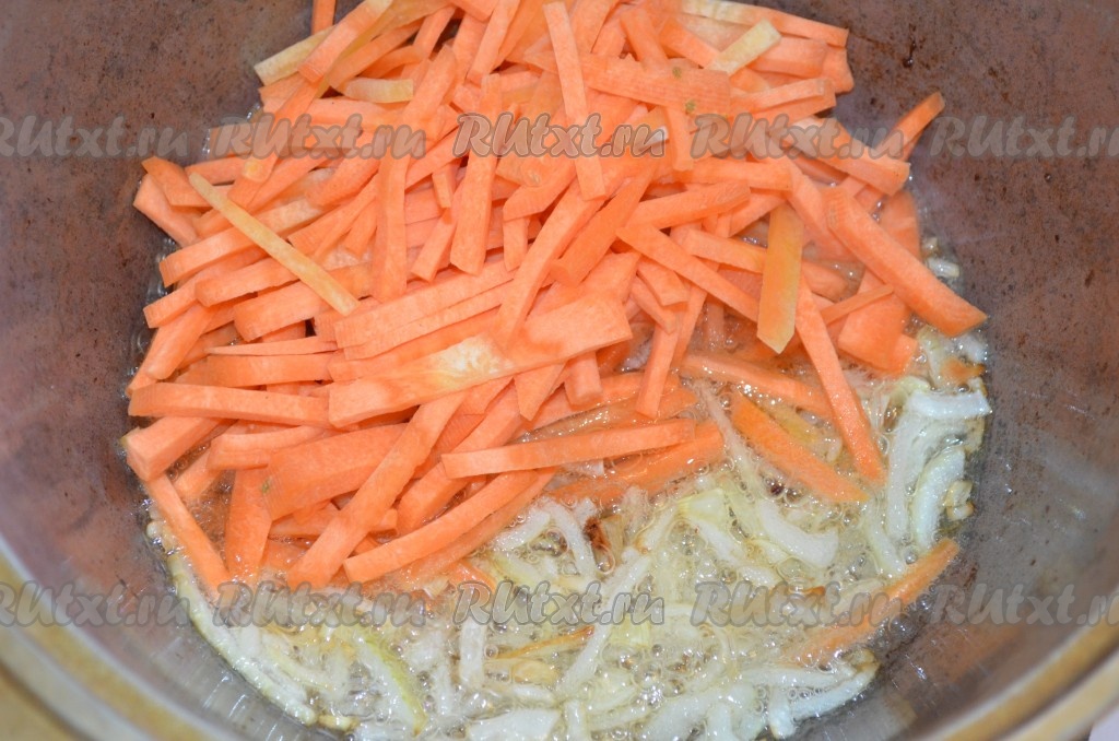 Морковь порезать соломкой, добавить к луку. Жарить, помешивая, на сильном огне 5-7 минут.