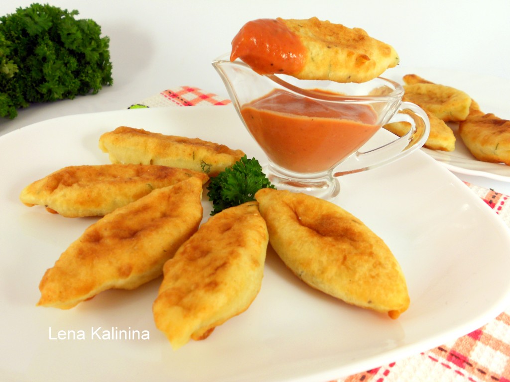 Сформировать пирожки, хорошо защипнуть. Обжарить эти необыкновенно вкусные картофельные пирожки с двух сторон на растительном масле на среднем огне до румяности. Подавать пирожки, приготовленные по этому рецепту, нужно горячими с острым соусом. Очень вкусно!