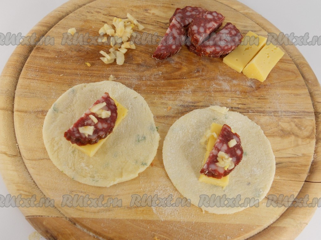 В центр каждого кружочка разместить начинку. В моем варианте - это ломтик сыра, кусочек колбасы и немного измельченного чеснока.