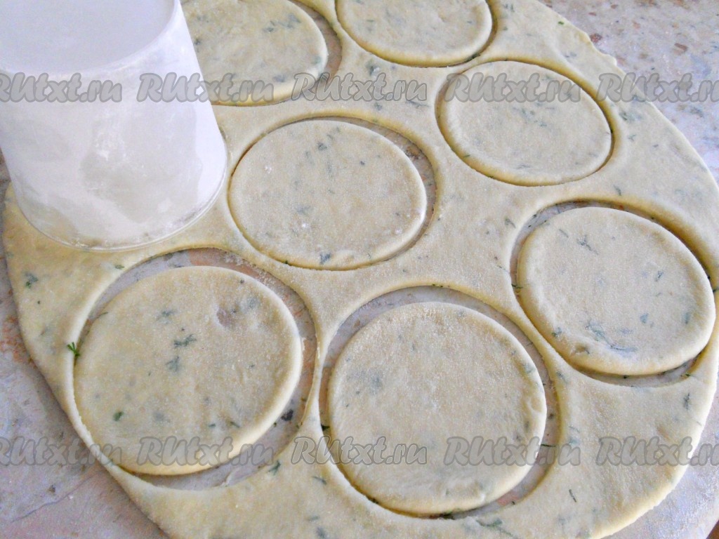 Далее тесто разделить на 4 части, каждую раскатать в пласт (стол присыпать мукой), толщиной около 0,5 см. Чашкой или стаканом вырезать кружочки.