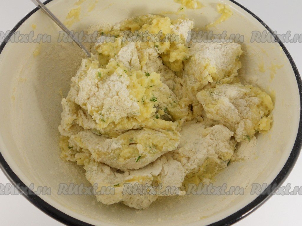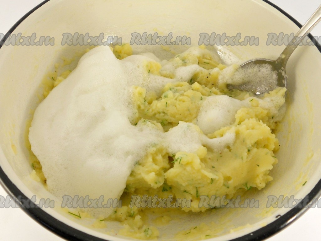 Оставленный белок взбить миксером до устойчивой пены и добавить в картофельную массу. Тщательно белок вмешать.