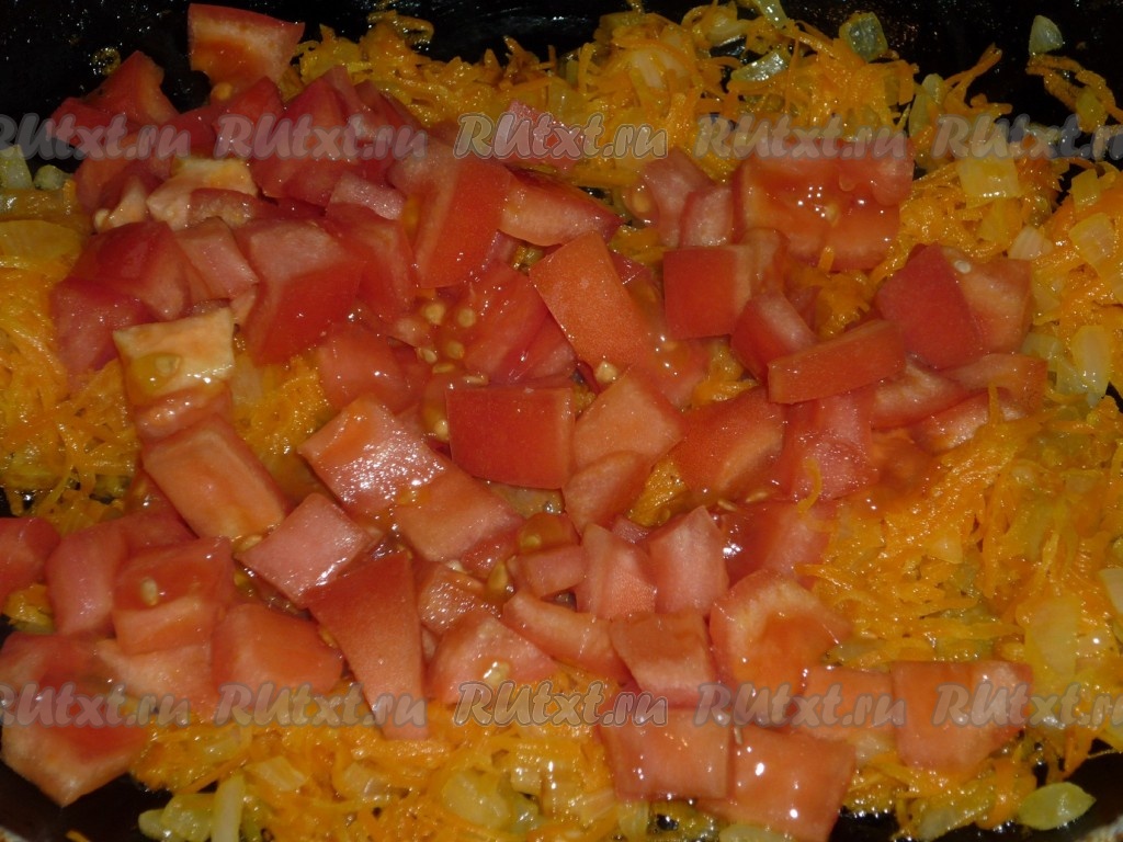 Затем к луку и моркови добавляем помидор, нарезанный кубиками, обжариваем овощи, помешивая, минуты 2-3, снимаем с огня, даём немного остыть.