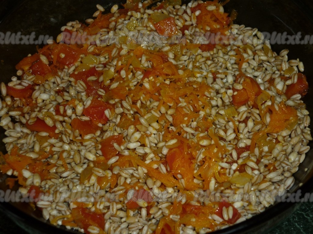 С перловки сливаем жидкость, добавляем обжаренные овощи и соль, перемешиваем.
