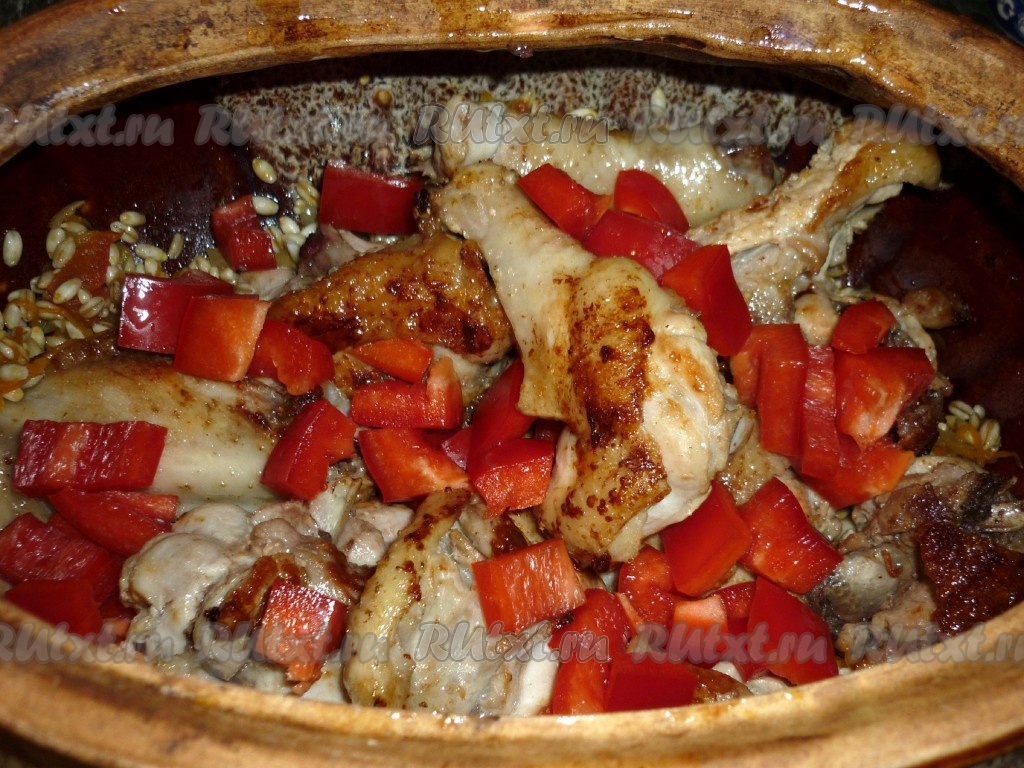 Болгарский перец режем кубиками. На дно горшочка для запекания выкладываем перловку с овощами, затем - курицу. Сверху кладём нарезанный болгарский перец.