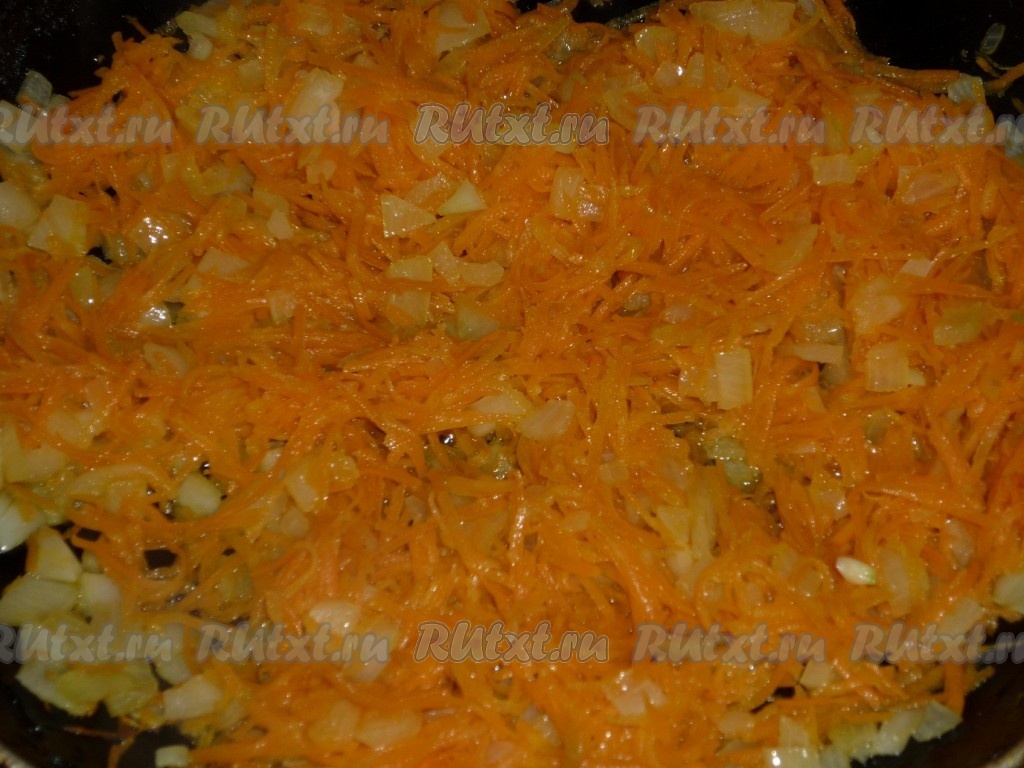 Очищаем морковку и лук. Из болгарского перца удаляем семечки и плодоножку. На сковороде прогреваем растительное масло, выкладываем мелко нарезанный лук и натёртую морковку, обжариваем на среднем огне, помешивая, в течение 7 минут (до мягкости овощей).