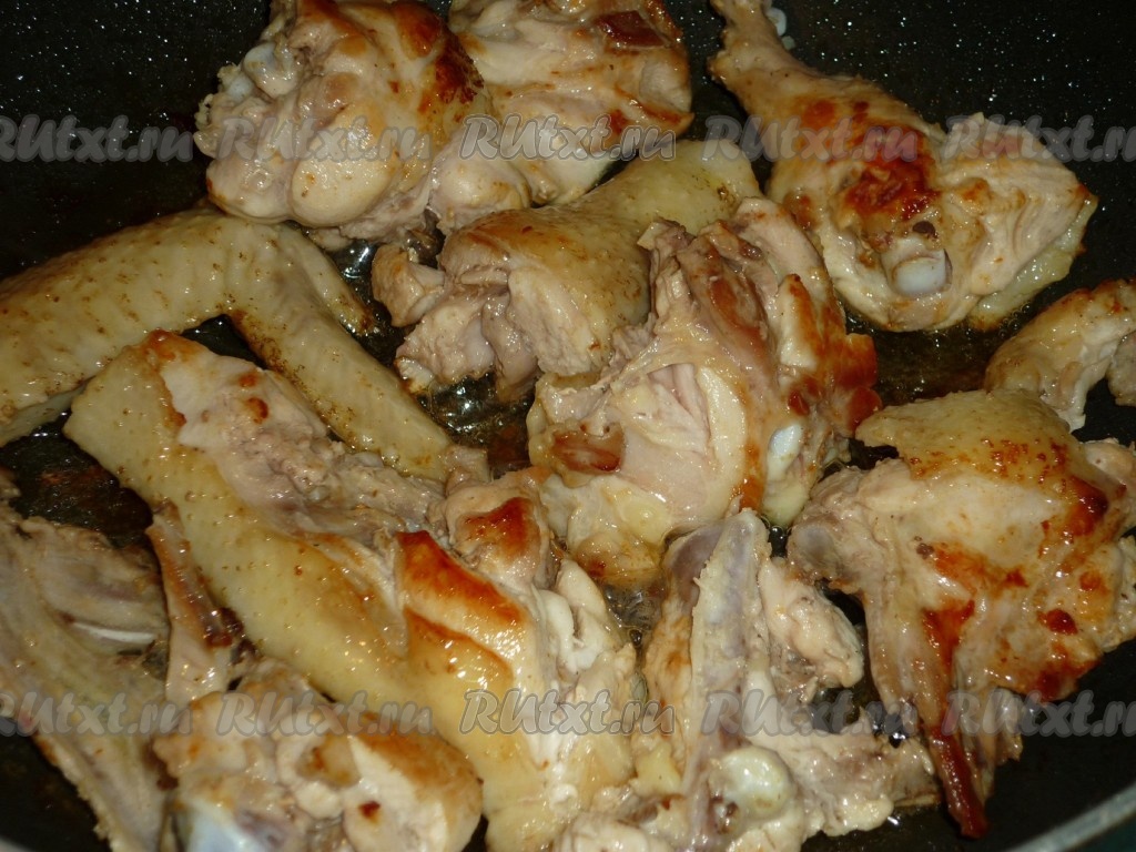 Порционные части курицы обжариваем на сковороде на растительном масле до золотистого цвета на среднем огне с двух сторон.