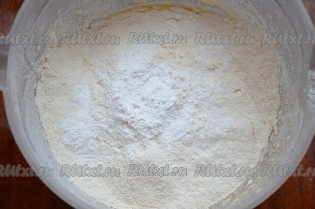 Затем просеять муку с разрыхлителем, перемешать, тесто получится в меру густым.