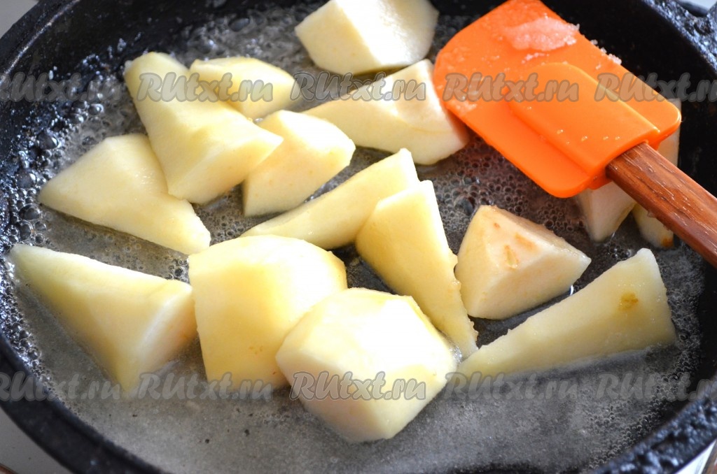 Груши очистить, разрезать сначала на 4 части, потом каждую часть ещё пополам. Сковороду нагреть, всыпать сахар, влить воду, перемешать, прогреть сироп 1-2 минуты. Добавить груши, томить в карамели 5 минут, периодически переворачивая с одной стороны на другую.