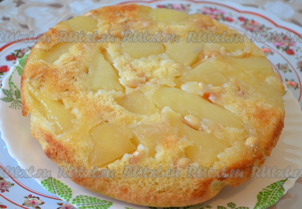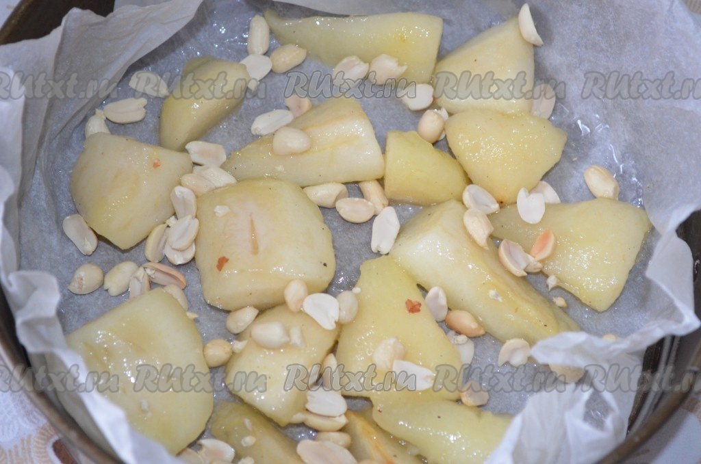Форму диаметром 20 сантиметров застелить пергаментом, смазать его маслом. Выложить груши, посыпать орехами, полить 3-4 столовыми ложами сиропа, в котором томились фрукты на сковороде.
