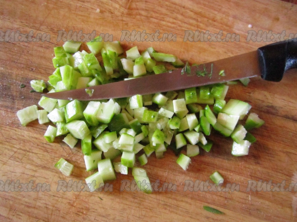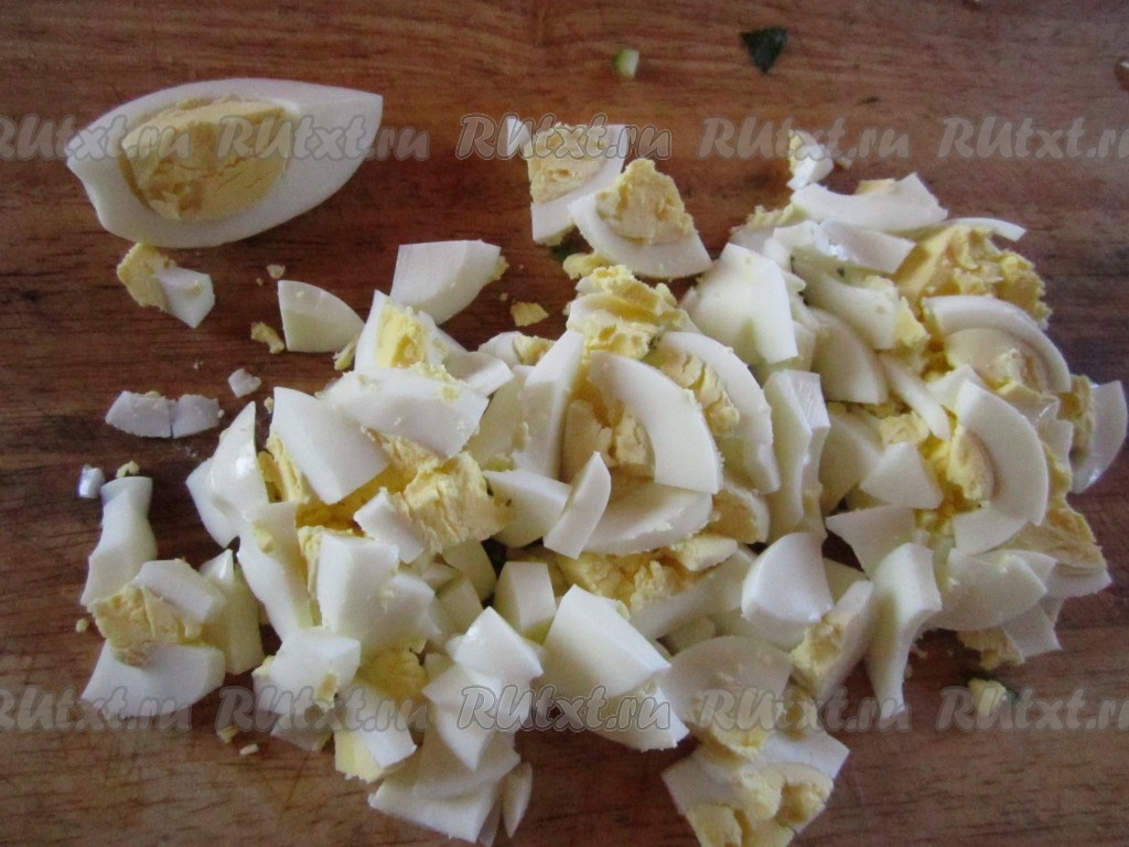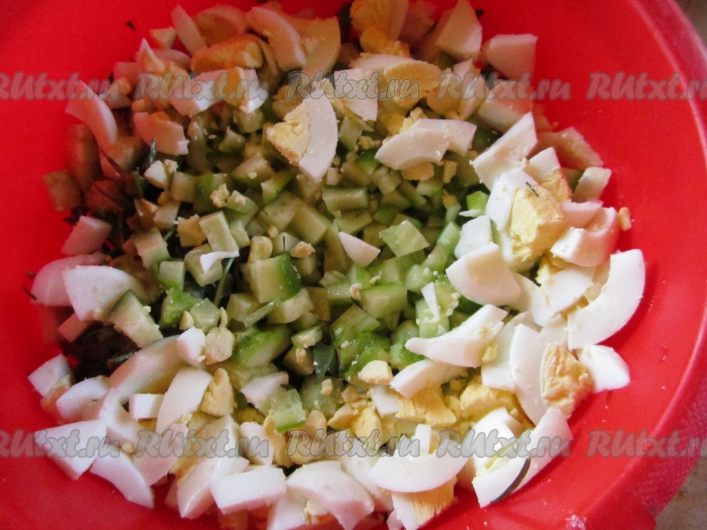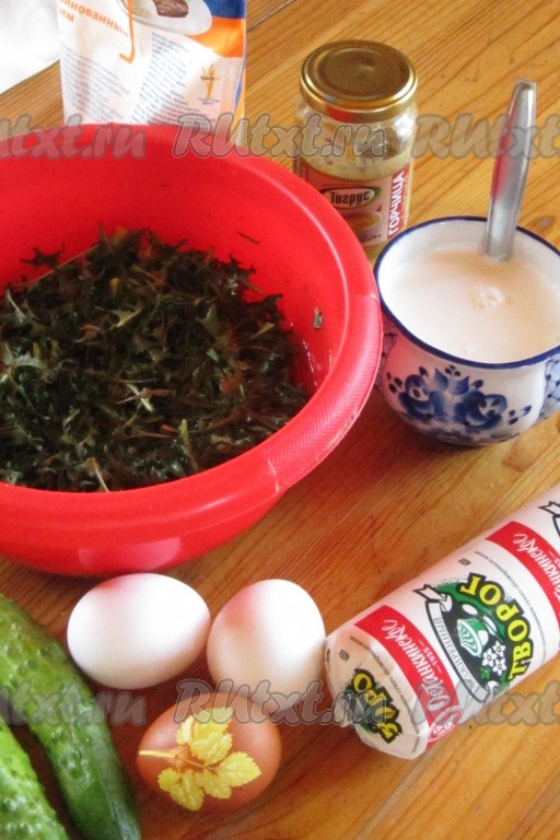 В миске соедините листья одуванчика, нарезанные огурцы и яйца.