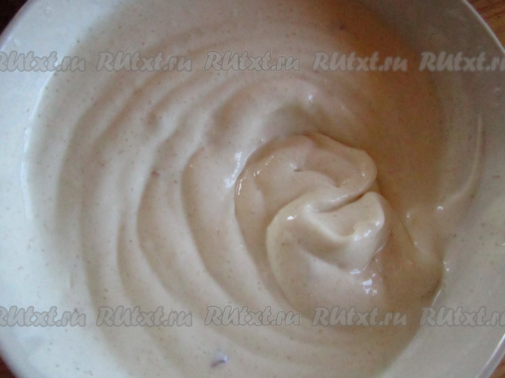 Приготовьте заправку. Для этого смешайте в чашке творог, сливки, майонез и горчицу. Добавьте сахар и посолите по вкусу.