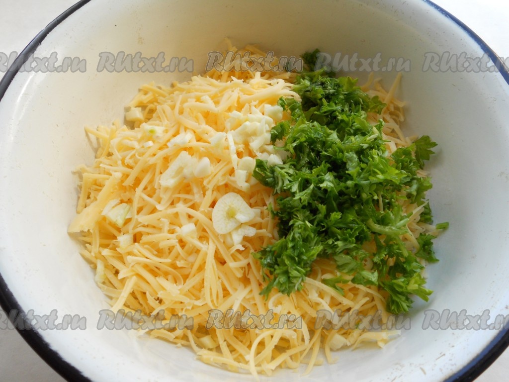 Для приготовления начинки сыр натереть на мелкой терке, посолить, добавить измельченную зелень и чеснок. Перемешать.