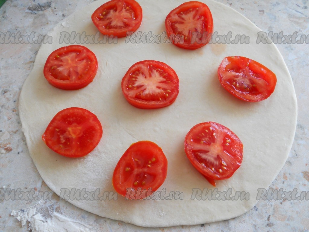 "Отдохнувшее" тесто разделить на 2 части, раскатать каждую в круглую тонкую лепешку. Помидоры порезать кружками (каждый помидор - 3-4 кружка). Разложить кружочки на лепешке на расстоянии друг от друга 2-3 см.