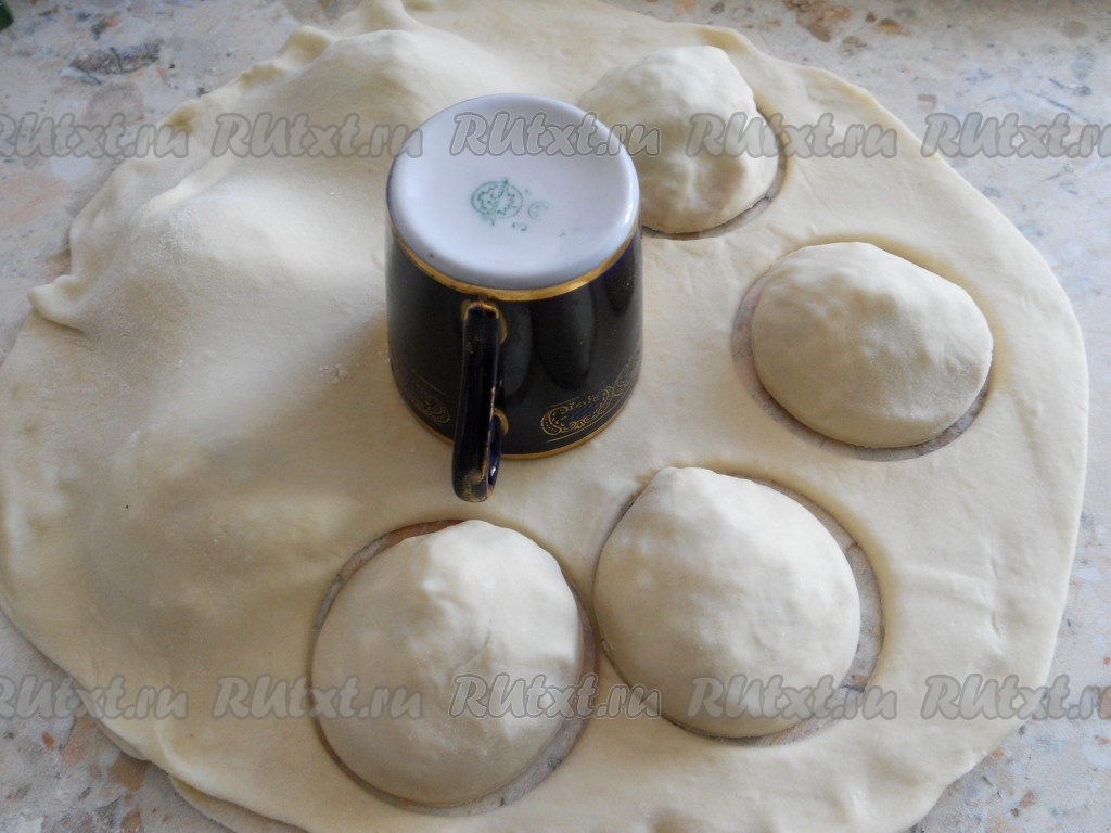 Аккуратно накрыть эту лепешку с помидорами второй лепешкой. Стаканом или чашкой, большего, чем кружки помидоров диаметра вырезать пирожки.