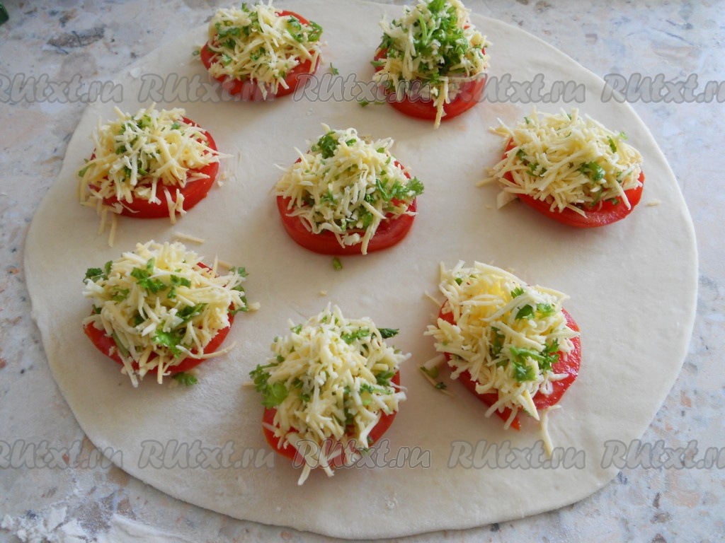 Сверху на каждый кружочек помидора поместить подготовленную начинку из сыра (щедро).