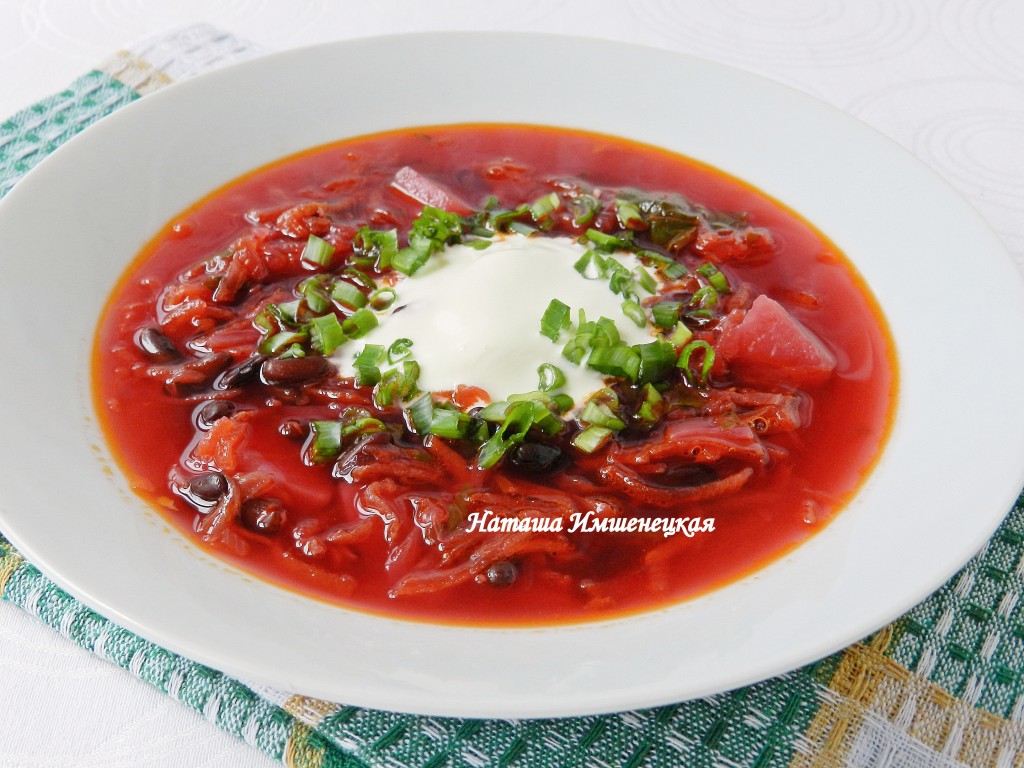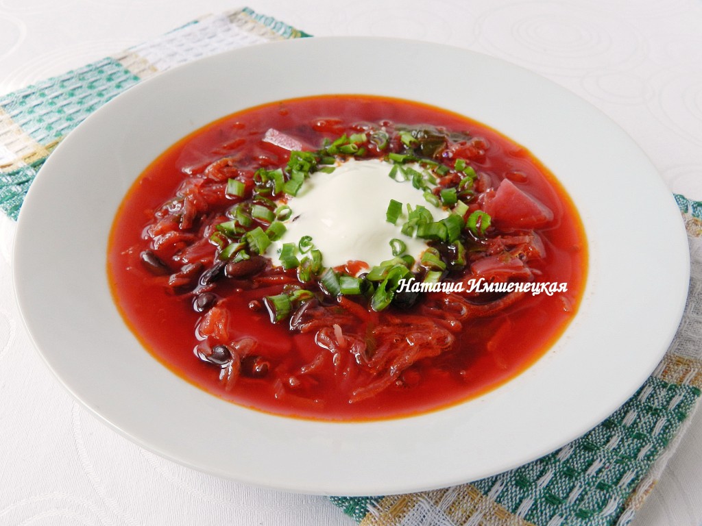 Если в борщ добавляется фасоль, ее нужно заранее замочить в холодной воде (на ночь), а затем поставить варить одновременно с мясом, но в другой кастрюле. Фасоль в зависимости от сорта варится от 20 минут до 1 часа.
