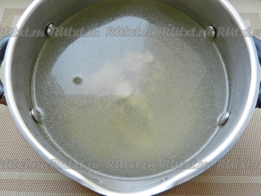 Мясо вымыть, залить двумя литрами холодной воды и поставить варить. Когда вода закипит, снять пену и варить бульон на медленном огне 1-1,5 часа в зависимости от мяса.
