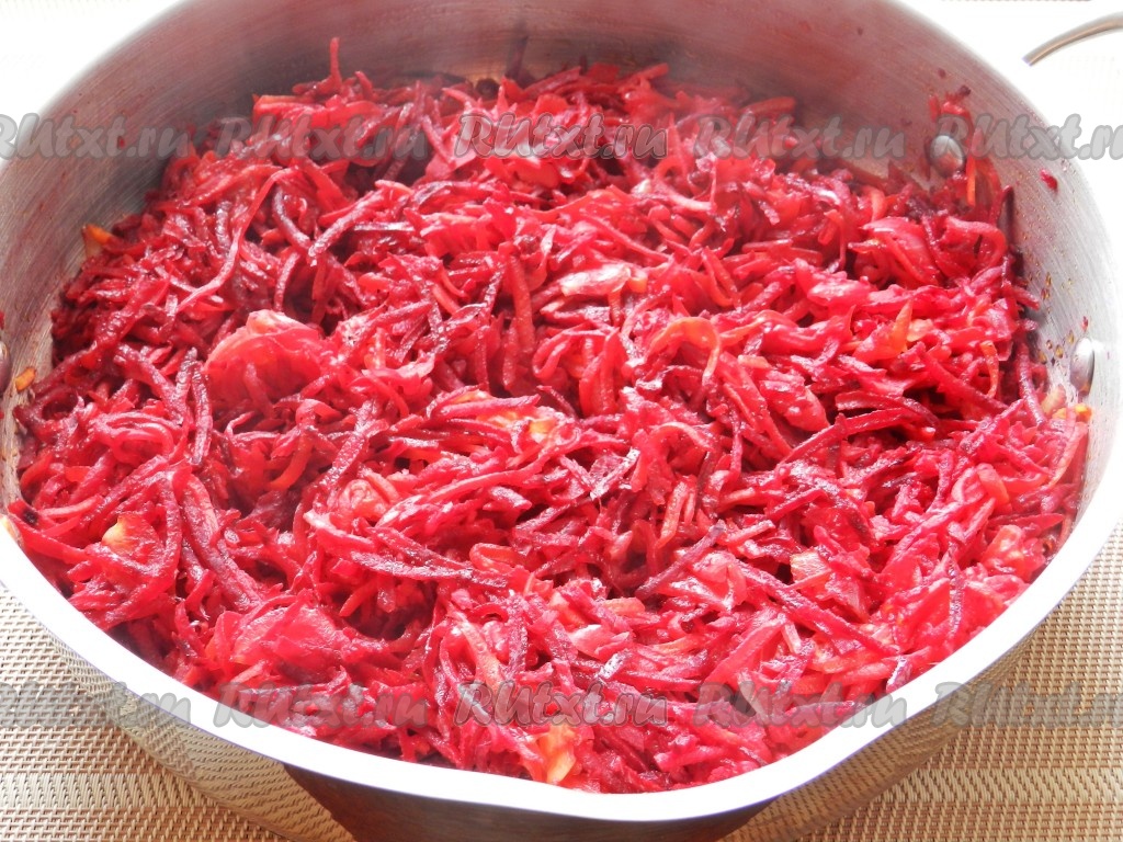 В сковороде разогреть растительное масло и обжарить сначала лук и морковь до приятного золотистого цвета. Посолить, поперчить. Затем добавить свеклу и обжарить все вместе. Чеснок пропустить через пресс и соединить с овощами. Влить немного бульона или воды, буквально 1/2 стакана, добавить томатную пасту и универсальную приправу. Все тщательно перемешать, уменьшить огонь, накрыть сковороду крышкой и тушить заправку для борща до мягкости овощей 20-30 минут.