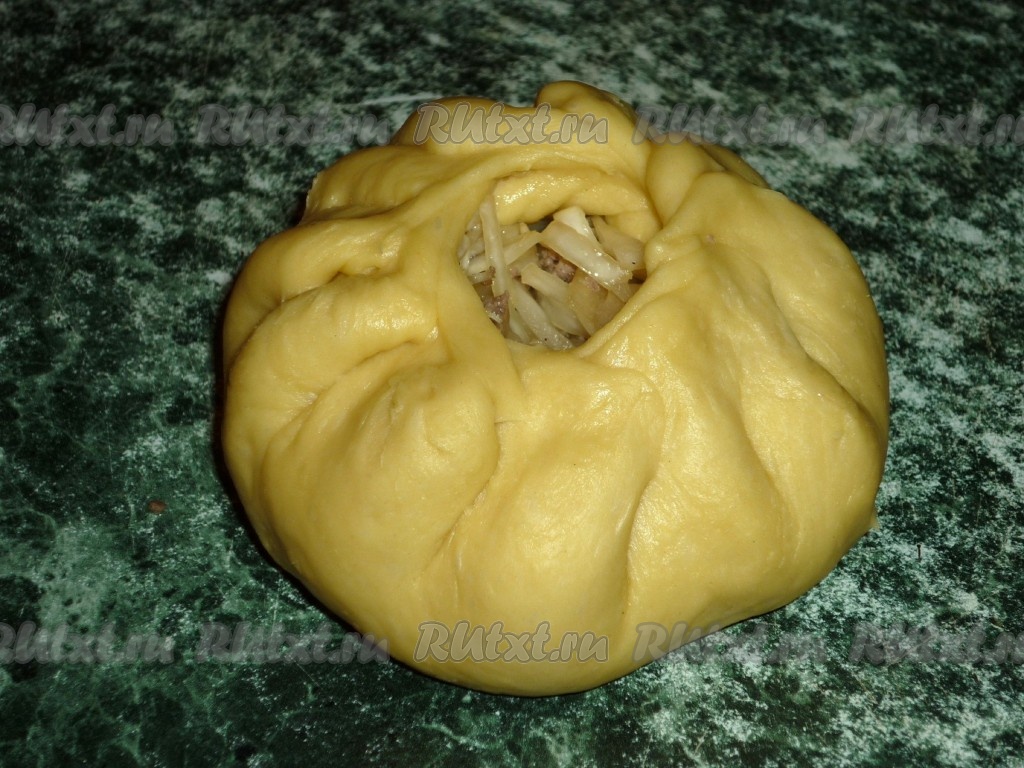 И начинаем защипывать тесто по кругу (получится пирог, напоминающий беляш).