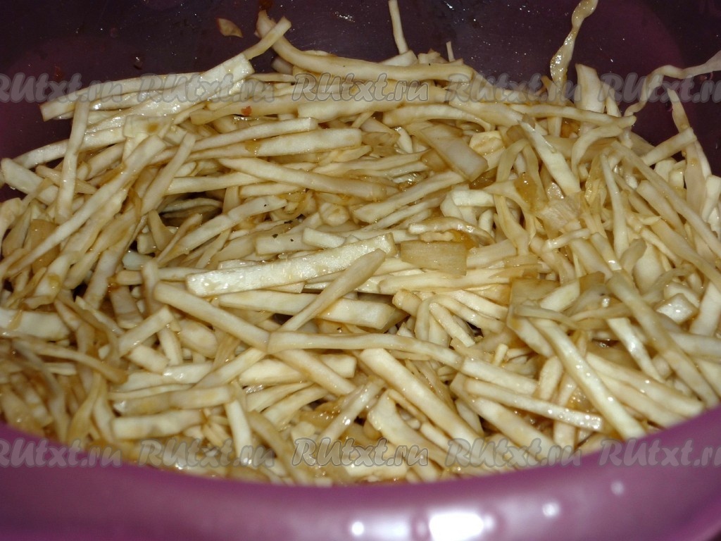 Солим, перчим, тщательно обминаем и оставляем на некоторое время, чтобы капуста промариновалась.