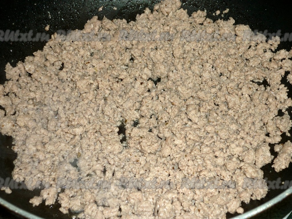 Фарш выкладываем на сковороду с разогретым растительным маслом и слегка обжариваем.