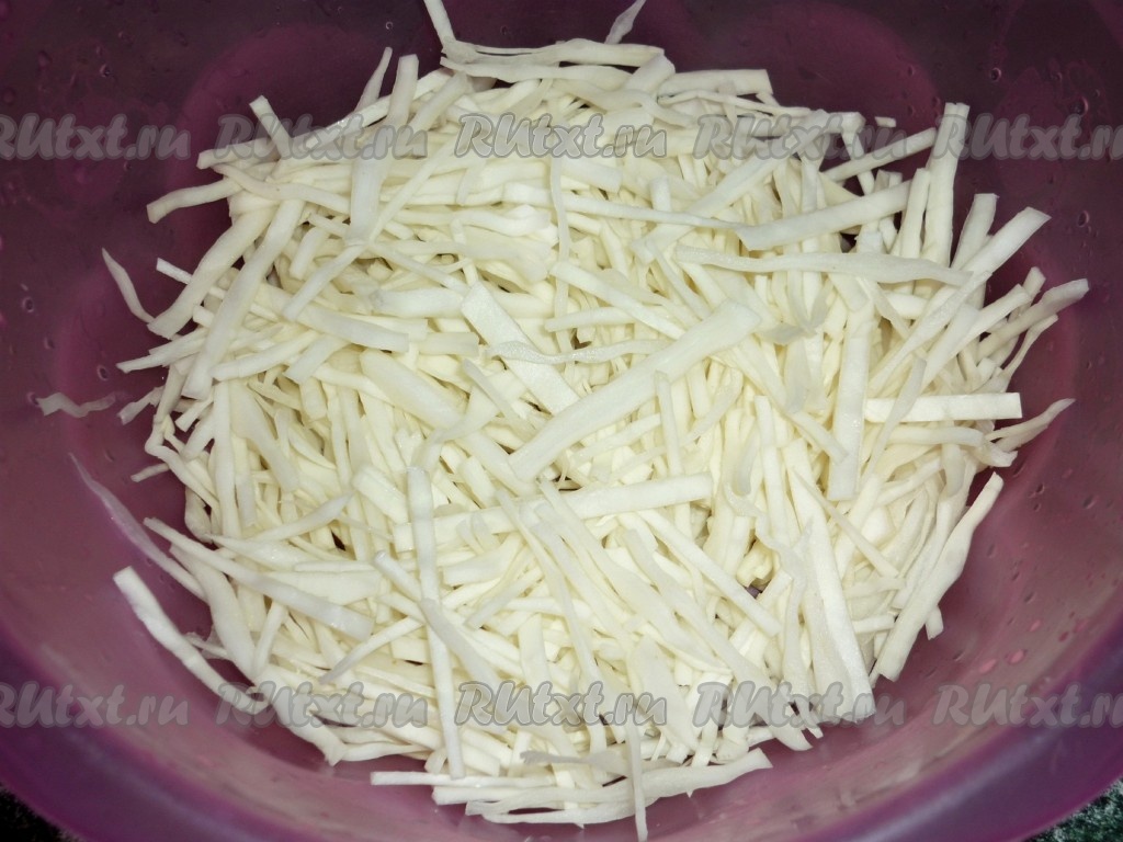 Для приготовления начинки капусту режем тонкой соломкой. Нарезаем достаточно мелко лук и чеснок.