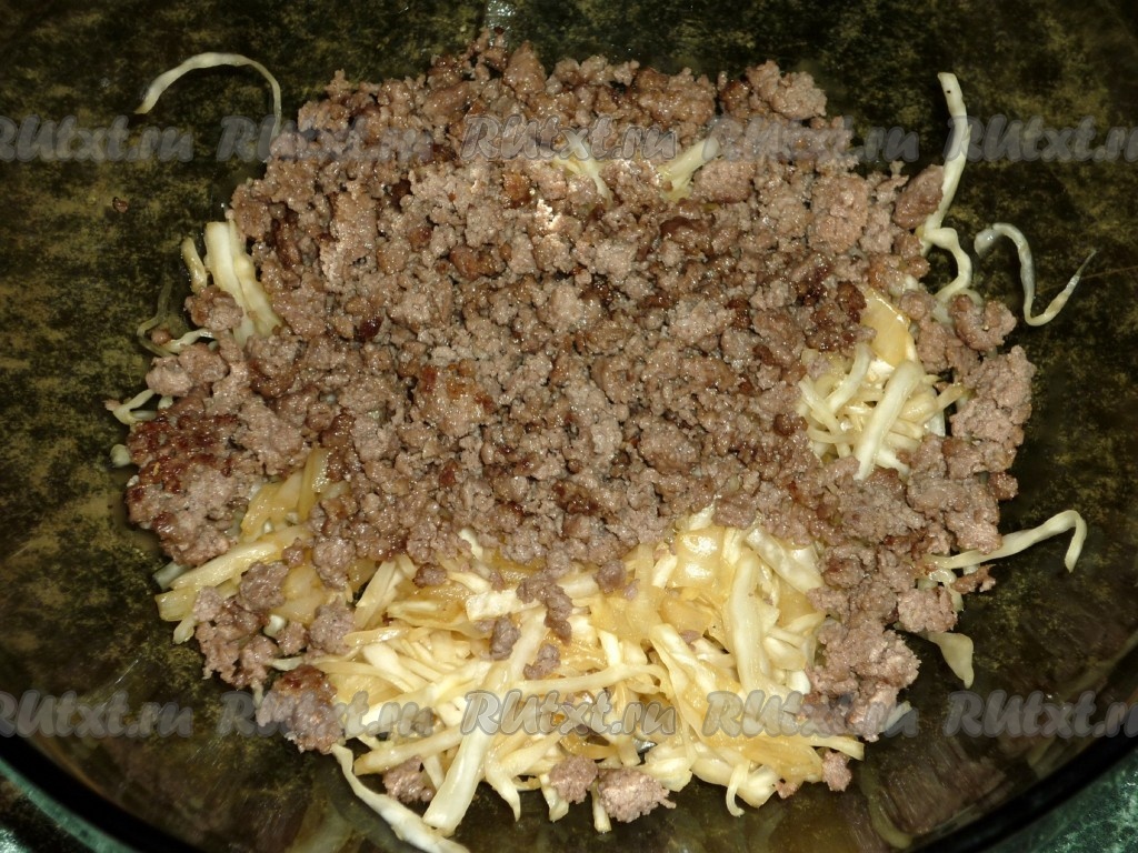 Когда подойдёт тесто, капусту, отжатую от выделившегося сока, смешиваем с обжаренным фаршем.