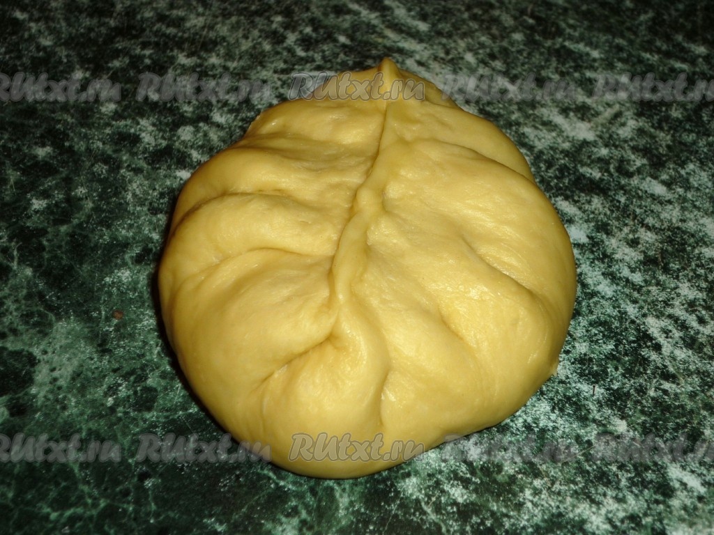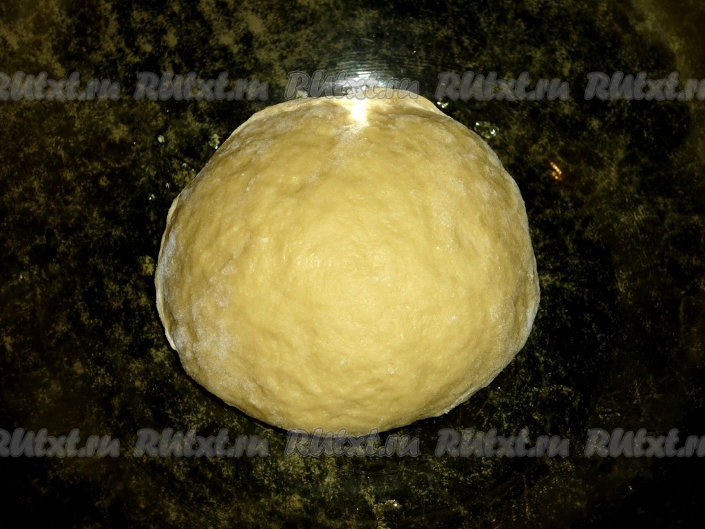 Постепенно добавляя просеянную муку, замешиваем тесто. Тесто должно стать эластичным и не липнуть к рукам. Накрываем тесто полотенцем и ставим в тёплое место, чтобы оно подошло. Поднявшееся тесто обминаем и опять ставим в тёплое место, чтобы оно ещё раз подошло (в общей сложности на поднятие теста понадобится примерно 1 час).