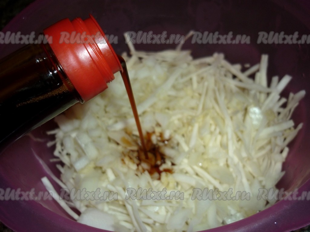 Капусту смешиваем с луком, чесноком и соевым соусом.