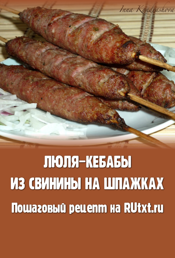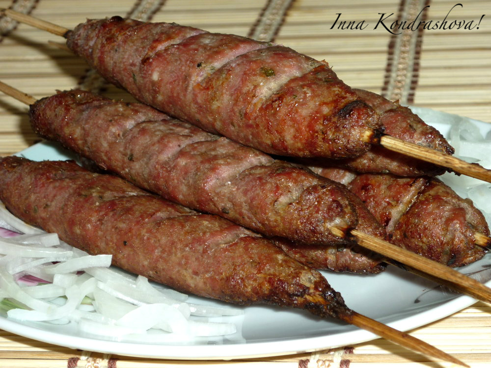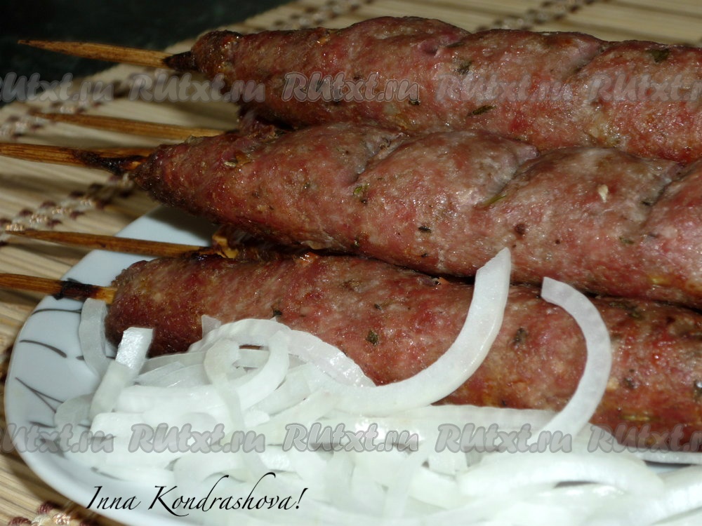 Вкусные, сочные люля-кебабы из свинины достаём из духовки и прямо на шпажках в горячем виде подаём к столу, дополнив маринованным луком и аджикой.