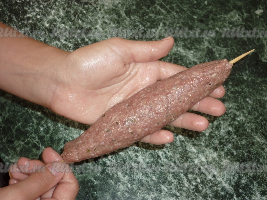 Замачиваем деревянные шпажки минут на 20 в холодной воде. Зрительно делим фарш на 6 частей. Руками, смоченными водой, из каждой части фарша формируем колбаску. В каждую колбаску продеваем шпажку. В результате у нас получатся 6 заготовок люля-кебабов из свинины.