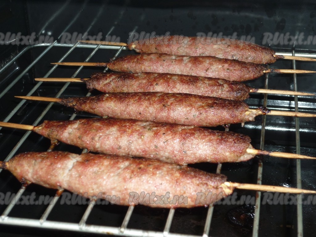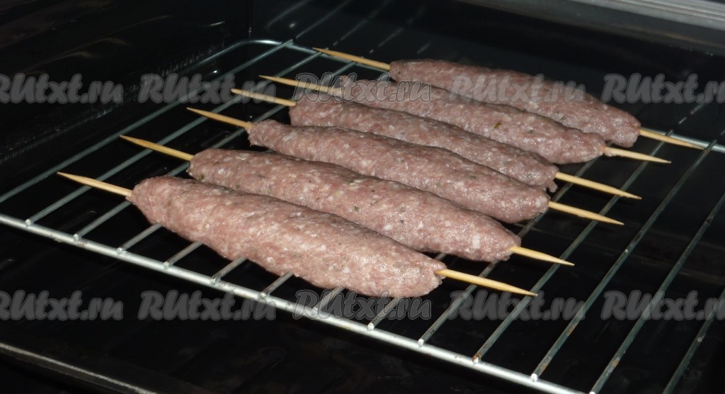 Ставим решётку с люля-кебабами в духовку, разогретую до 200 градусов. Советую в духовку под решётку поставить противень, чтобы на него в процессе приготовления стекал сок от мяса.